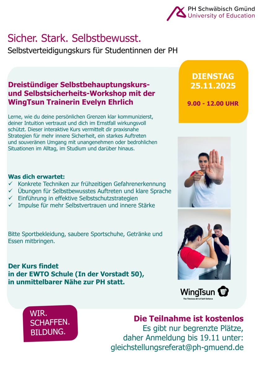 Der Kurs wurde vom Gleichstellungsreferat der PH Schwäbisch Gmünd organisiert und war für Studentinnen kostenlos. Die PH reagierte kurzfristig auf die hohe Nachfrage und stellte zusätzliche Mittel bereit, um mehr Studentinnen die Teilnahme zu ermöglichen. Die Rückmeldungen waren durchweg positiv. Eine Teilnehmerin betonte: „Ich habe wirklich sehr viel mitgenommen und bin sehr glücklich, mich rechtzeitig angemeldet zu haben. Evelyn, die Kursleiterin, war super sympathisch, professionell und begegnete uns mit großem Respekt.“