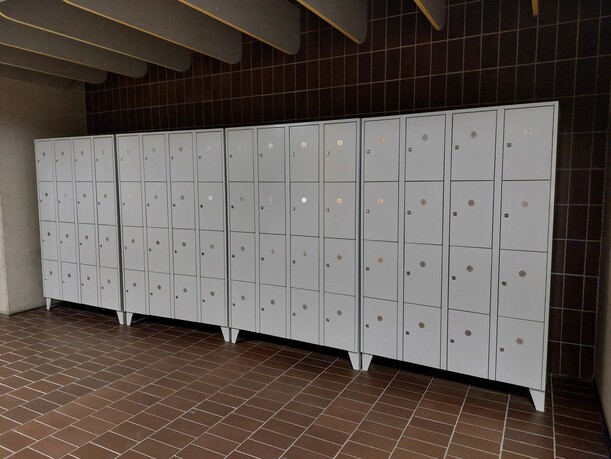 Die Schließfächer befinden sich unterhalb der Treppe im Hörsaalgebäude, Erdgeschoss. Sie können in der Bibliothek einen Schlüssel ausleihen.