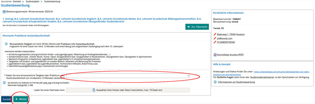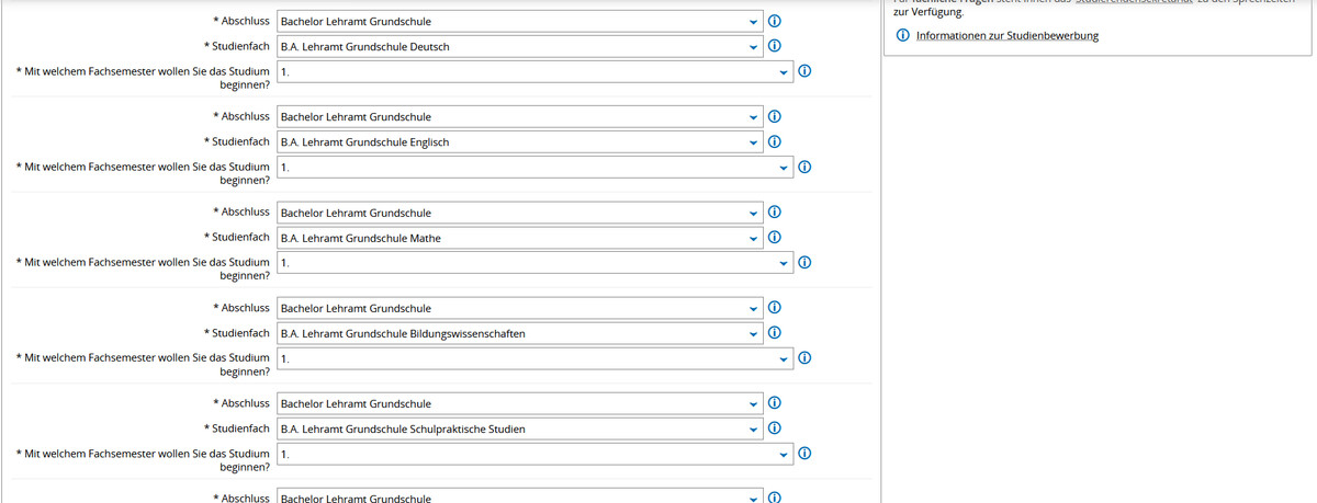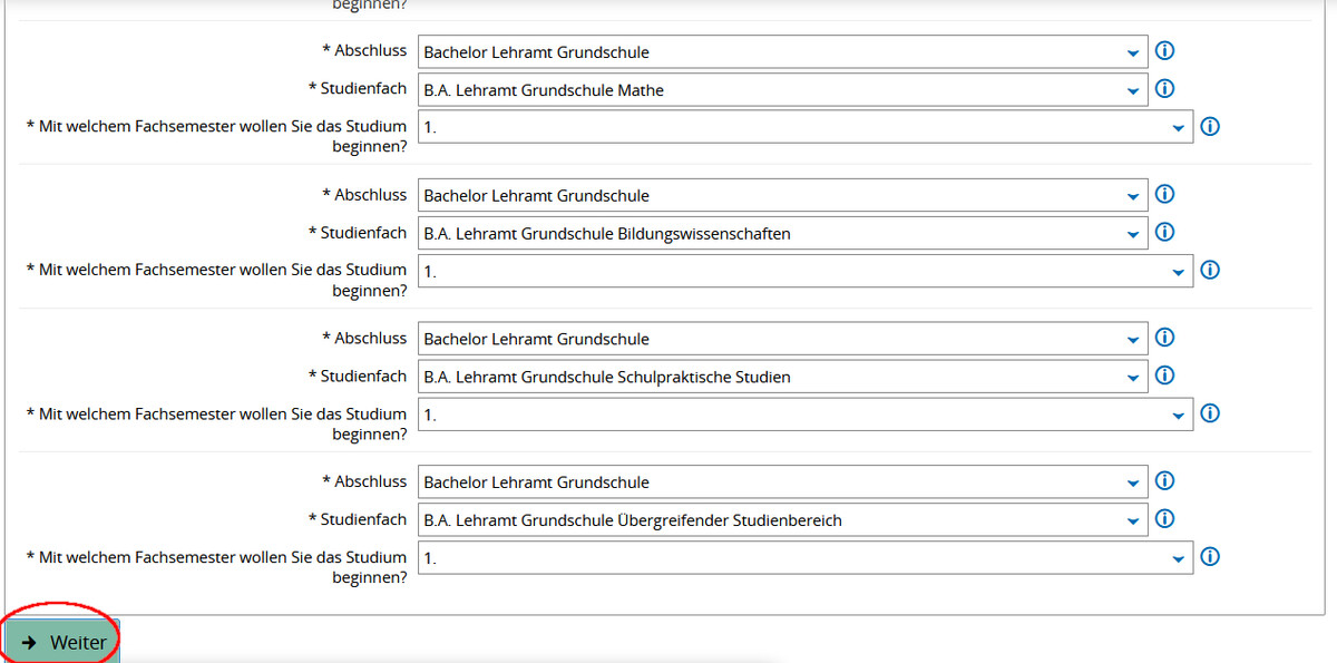 Abschluss und StudienfachIn unserem Beispiel wird ein Bewerbungsantrag für das Studium Lehramt-Grundschule angelegt. Sie müssen sich nun durch die einzelnen Schritte durchklicken. Beachten Sie hierzu die Hinweise.