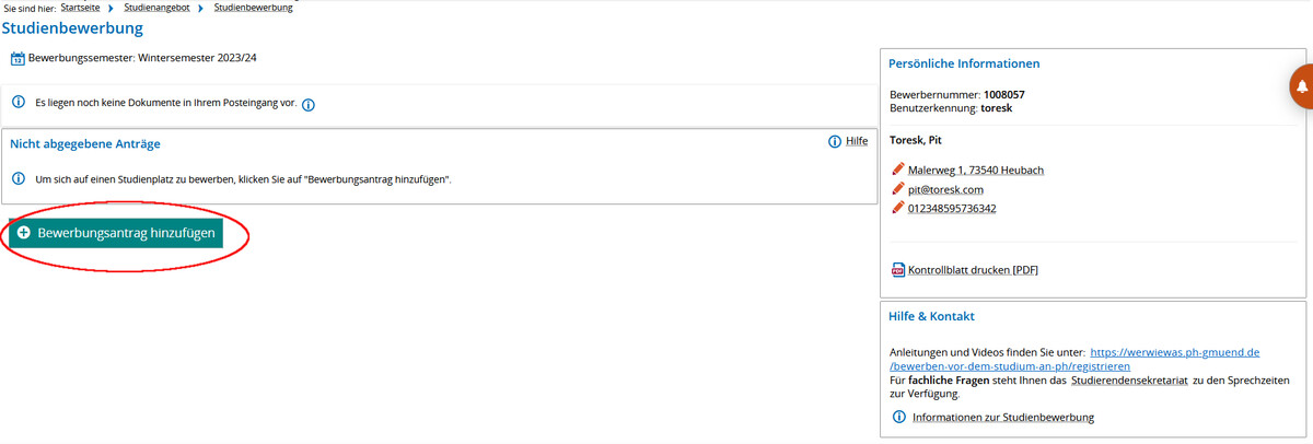 Hier finden Sie nochmal alle wichtige Daten zusammengefasst. Rechts Ihre Kontaktdaten und wo Sie bei Fragen Hilfe finden. Links die Übersicht über Ihr bereits abgegebenen Bewerungsanträge. Und unten den Button Bewerbungsantrag hinzufügen, mit welchem Sie den Vorgang starten.