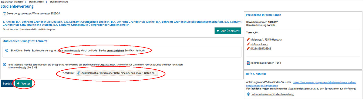 Wenn Sie sich auf einen Lehramtsstudiengang bewerben möchten, müssen Sie einen Lehrerorientierungstest für Studieninteressierte durchführen und das Zertifikat unterschrieben hochladen.
