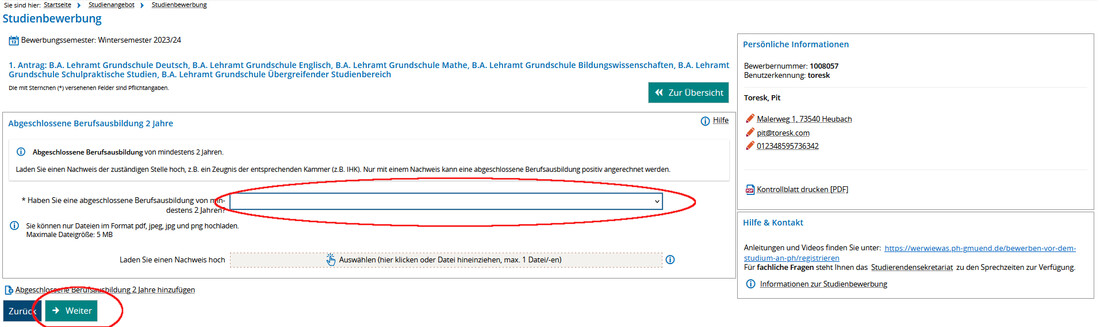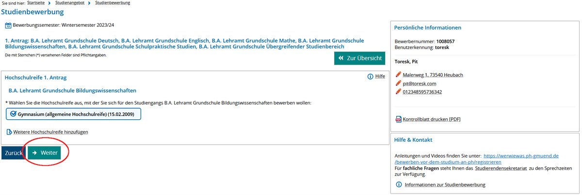 Hier wird Ihnen die zuletzt eingegebenen Hochschulreife angezeigt. Falls Sie eine weitere haben, können Sie über den Menüpunkt Weitere Hochschulreife hinzufügen eingeben und die korrekte auswählen. Wenn die richtige ausgewählt ist, klicken Sie auf Weiter.