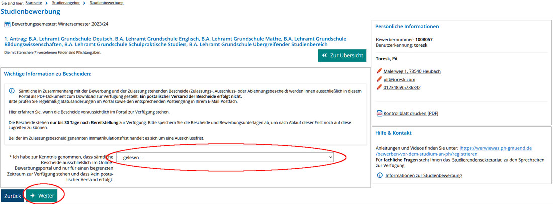 Hier bestätigen Sie die Kenntnisnahme, dass sämtliche Bescheide im Online-Bewerbungsportal zur Verfügung stehen und dies auch nur für eine begrenzte Zeit.