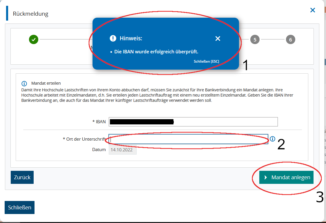 Geben Sie Ihre IBAN ein, diese wird nach der Eingabe direkt überprüft und es erscheint ein Pop-Up-Fenster (1).