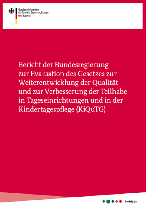 Faas, S. / Kluczniok, K. / Stöbe-Blossey, S. / Dahlheimer, S. / Schneider, M. / Aden, H. / Fitzner, J. / Fischer, S. / Zhao, C. (2023). Abschlussbericht der Evaluationsstudie zur Umsetzung des Gesetzes zur Weiterentwicklung der Qualität und zur Verbesserung der Teilhabe in Tageseinrichtungen und in der Kindertagespflege (KiQuTG). In: Bundesministerium für Familie, Senioren, Frauen und Jugend (BMFSFJ) (Hrsg.), Zweiter Bericht der Bundesregierung zur Evaluation des Gesetzes zur Weiterentwicklung der Qualität und zur Verbesserung der Teilhabe in Tageseinrichtungen und in der Kindertagespflege (KiQuTG). Berlin: Bundestagsdrucksache.